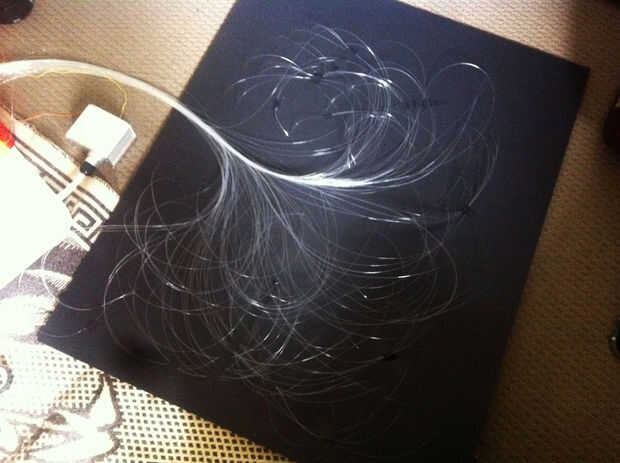 Ahora puede empezar a roscar la fibra óptica a través de los agujeros que sólo apuñaló con el destornillador de precisión.