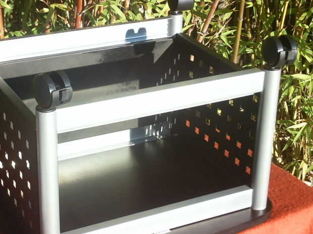 Atornillar las patas delanteras "A" a la parte superior "D" (Asegúrese de que el final de la rueda es para arriba) y coloque las ruedas en las patas. Tiene la opción de poner las dos ruedas asegurables en el frente, como se sugiere en las instrucciones, o en la espalda. Después de golpear accidentalmente las cerraduras varias veces con el pincel de mis pies, te sugiero poner en la parte de atrás así la Scoot siempre puede moverse libremente (imagen tiene en frente).