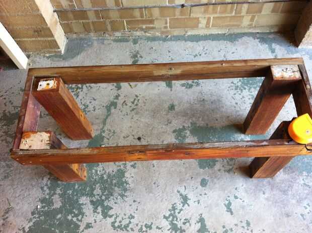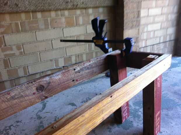 Poner banco vertical sobre superficie plana y compruebe que las patas del Banco a la misma altura (es decir no debe tambalearse en un piso plano) ajustar posiciones de la pierna si es necesario. En teoría se debe comprobar para la Plaza, pero siendo madera de palet, es poco probable ser cuadrado molido y libre de combarse, ventosas, etc. así que lo principal para mí era hacer pequeños ajustes hasta que el Banco era estable y no de la roca o tambalearse.