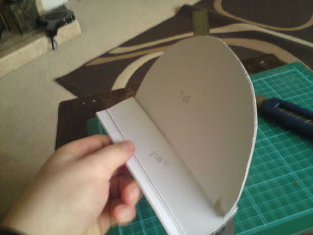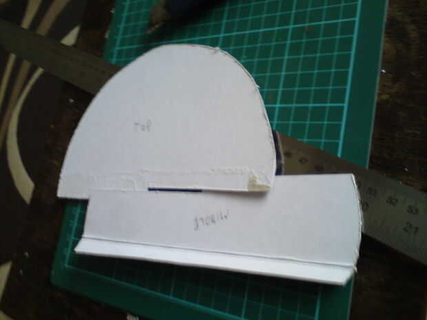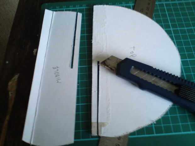 Primero doblar la pieza central en la parte delantera cerca de 1cm a aproximadamente 45 grados, en el otro lado sólo cortar las ranuras de manera un poco y a medio camino a través de cada pieza, ahora puede ranura los pedazos juntos, usted querrá mantenerlo sin pegar para que puedas acceder a las interioridades.