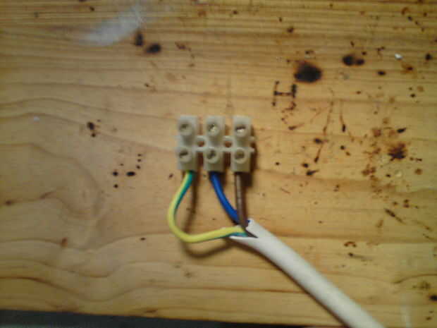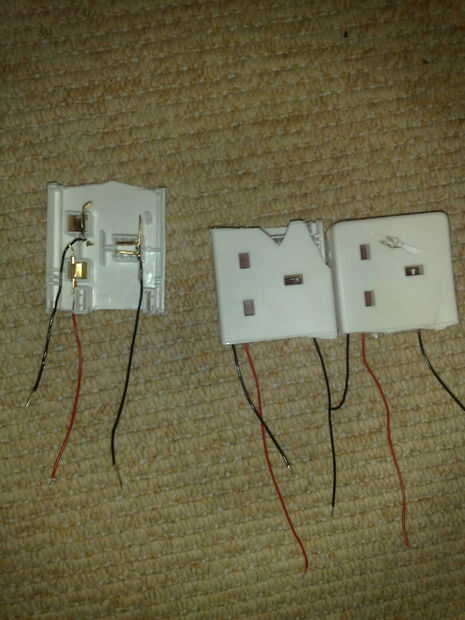 Ahora añadir los cables a las piezas de metal girando, jamming o soldar, me torcí los bien por que no tengo un soldador a mano, pero interpuso entre el metal y el plástico bien! Yo rojo vivo, negro para la tierra y como Ii sólo tenía, utilicé negro para la tierra también. Como se puede ver que están separados con bastante seguridad. Entonces o bien pegamento o con cinta adhesiva detrás.