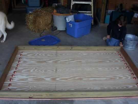 Para el tamaño de la caja del colector fue dictado por el tamaño de cristal (76″ x 46″). Aquí está mi pequeño ayudante buddy Muggy (mi hijo de 6 años) ayudando a que mí colocar las guarniciones de cobre - fue de gran ayuda a lo largo de todo el proyecto :). También se puede ver parte de mi pastor alemán lúpulo - no fue de gran ayuda: