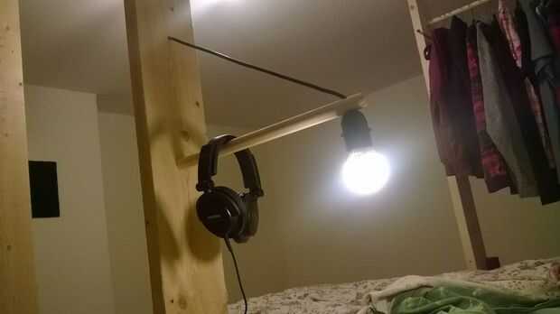 Para hacer esta lámpara, adjunte un trozo de espiga de madera de la misma manera que esté con el estante de la ropa, perfore un orificio a través del extremo de la espiga y a través de la tabla con el pasador en su lugar, un poco por encima de la espiga.