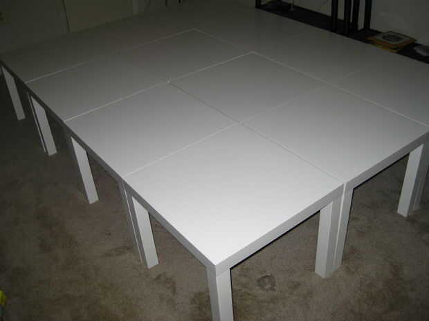Organizar los doce tablas side-by-side - tres en un lado, cuatro en la otra cada mesa son 21,625 "x 21,625" por lo que será la dimensión final de la cama de plataforma 86,5 "x 64,875" - que es ligeramente más grande que un colchón de tamaño queen estándar de 80 "x 60" pero una vez la cama sábanas y fundas en el colchón, no he encontrado a ser un problema.