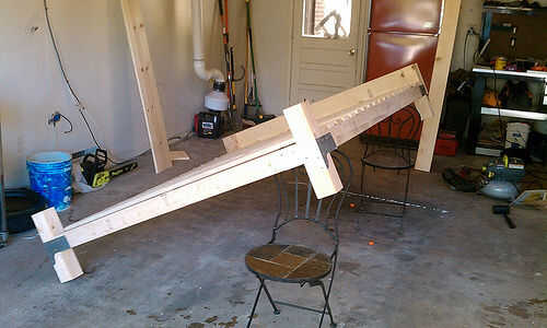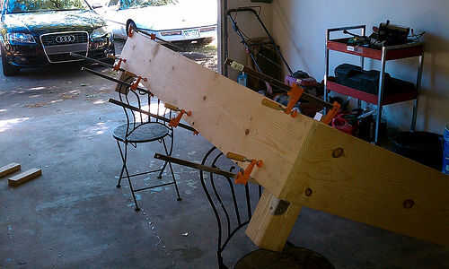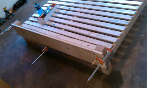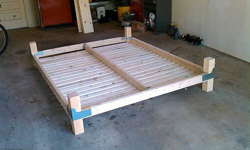 Utilizando los pies de la cama como la primera pieza, prepárate lo que no será demasiado difícil fijar las abrazaderas y alinee la Junta exactamente a la parte superior de las piernas (también, si usted no ha calculado hacia fuera, levantar la estructura trasera derecha). Luego, Aplique pegamento de madera en el borde a lo largo de las piernas y el marco donde el pino se reunirá. Lo, fije firmemente en su lugar y entonces disparar a la pistola de clavos, algunos clavos del tiro allí para ayudar a mantener en su lugar. Limpie el exceso de pegamento apagado y deje que se seque durante 20 minutos o menos y puede quitar las pinzas y pasar a las piezas laterales. Las uñas hacen su trabajo el resto del camino.