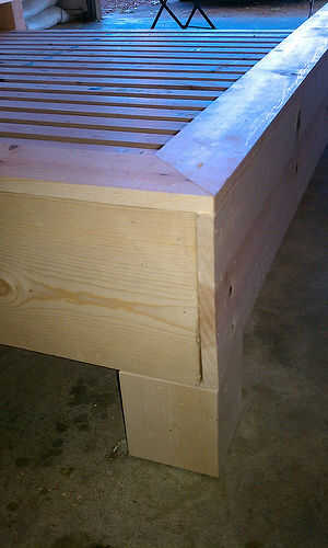 Tan bonito como las patas de 4 x 4, necesitará hacer incluso con la moldura. Así que lo que hice fue cortar algunos pedazos de desecho 1 x 6 a 1/4" a menos de la altura de la pierna. Esto permite cierto margen para que el 4 x 4 todavía apoya la cama y no su madera colocado arbitrariamente. Y es lo suficientemente largos que parece que es su reposo. De todos modos, pegue y clave estas piezas en. Sólo que las esquinas exteriores e inglete el borde, para que sea tan limpio como podría hacer que se vea.