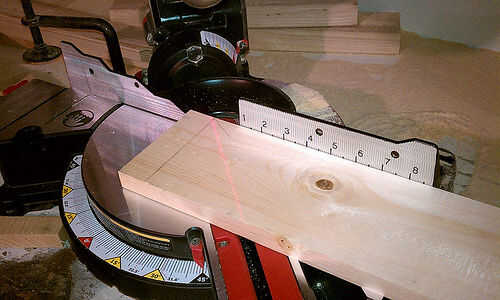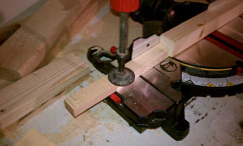 Este paso es probablemente completamente innecesario, pero otra vez, soy un hombre que disfruta de overkill. Así que vamos a ir a lo largo y colocar mini "tacos" a lo largo del borde de la moldura para mayor apoyo para la parte superior y lateral guarnecido. Para hacer esta medida exactamente a la altura del marco de la viga a la parte superior del pino. Ahora tome su 2 x 2 y cortar unos 15 o así que las piezas a la misma altura. Para hacer este más fácil, pinza a que un trozo de madera en el extremo de la ingleteadora Sierra la distancia apropiada de la hoja, así que no tienes que medir cada pieza, sólo usted puede tope contra la chatarra y todos tener la misma longitud. Hay una foto aquí para mostrar lo que quiero decir también.