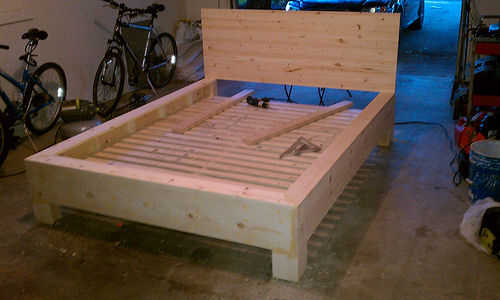 Usted puede hacer lo que desee, pero primero le diré cómo unen (de modo que puede ser extraíble más adelante). Tomar algún desecho 2 x 4 la altura de la cabecera que desee y sujetarlos ligeramente superior a la base de la cabeza de la cama (en el 4 x 4). No sé si expliqué ese derecho, por lo que es una imagen.