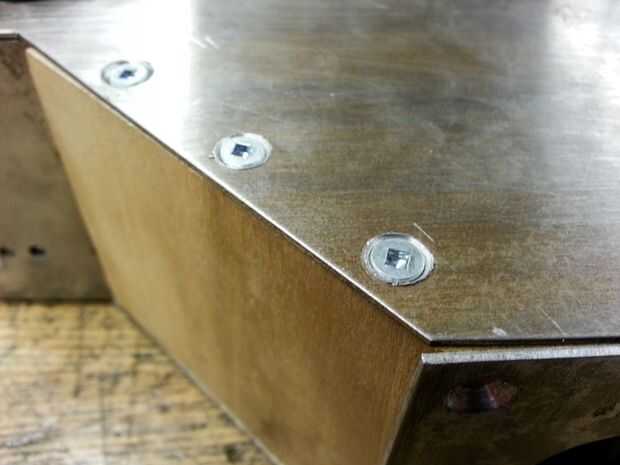 Una vez que los agujeros se hacen las placas de acero pueden avellanadas para que las cabezas de los tornillos queden al ras con la superficie.