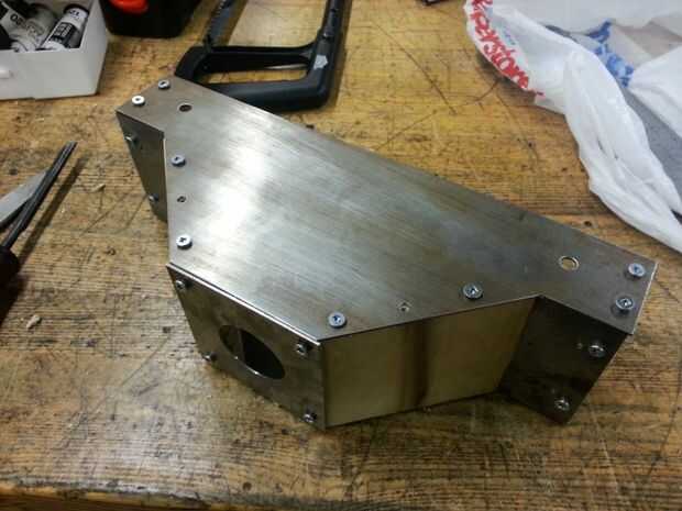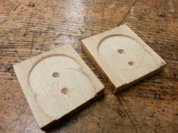 Corté los cartabones en las piezas de madera mediante una sierra de mesa con la hoja inclinada 45 grados. Los agujeros en el borde son hacer de la madera entre las placas superior e inferior, utilizando como plantilla de sujeción. Más espacio libre requerido para el elemento posterior de la lente, esto se hizo utilizando un accesorio de lijadora de tambor para una prensa del taladro.