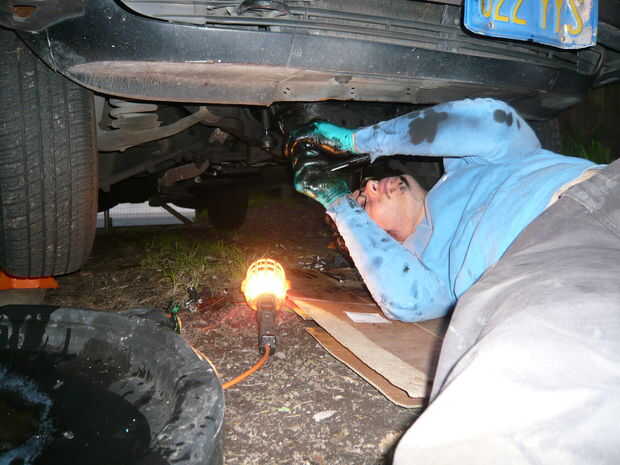 Utilizar la toma de 13mm o una llave para remover la cacerola de aceite del enchufe. Oh y lo va a coger el aceite en el agujero del tapón.