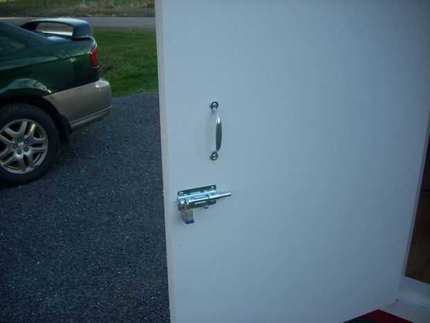 Colgué la puerta. Tiene tornillos en el interior y exterior (exterior puede bloquearse abierto o cerrado para evitar que 'accidentalmente' que encerrado en su interior).