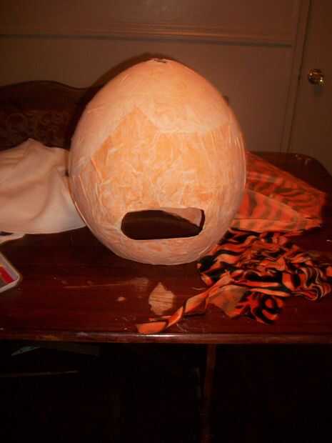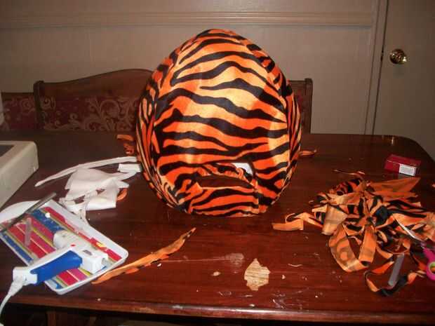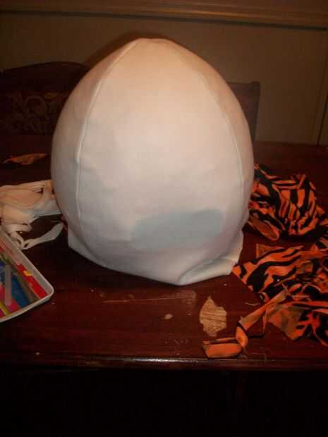 empecé con una cabeza de papel maché. Papel maché es agua, harina y la sal mezclan como panqueques masa (un poco más delgado). Utilicé tiras de papel de impresión naranja, vista es más agradable en el interior del periódico. Cubrí un globo del sacador con 5 capas y dejar seco durante la noche. Hizo estallar el globo a la mañana siguiente, cortar un agujero en la parte inferior de la cabeza y la boca del tigre donde podrás ver a través. Luego cubrí la cabeza con dos capas; el primero fue el blanco paño grueso y suave y la segunda fue la tela de rayas de tigre. Usé el blanco paño grueso y suave simplemente para hacer un acabado más liso. Para facilitar una forma de medir la distancia alrededor de la cabeza, dividirlo por 4 y cortar 4 tiras. Mina era 48" alrededor así que utilicé tiras de 12" (4). Cortar las tiras de 3/4 de la forma de la curva para arriba y llegado a un punto. Coser los lados y puntos juntos. Deslice sobre la cabeza, pegar los extremos dentro de la parte inferior. Entonces la boca abrir y coser que en el interior también. Repetí este proceso para la tela de tigre también. En el camino que me di cuenta que pasé demasiado tiempo preocupándose acerca de mis costuras Cuando acabé cubriendo mucho de él con la piel, así que preocupaciones en un perfecto no ajuste.