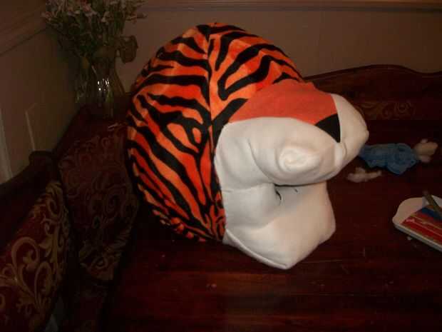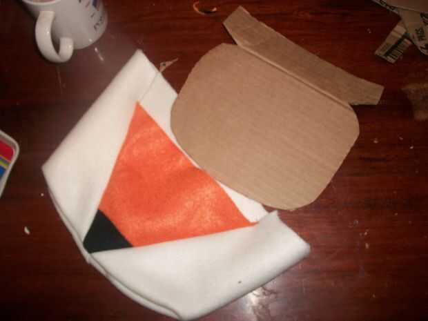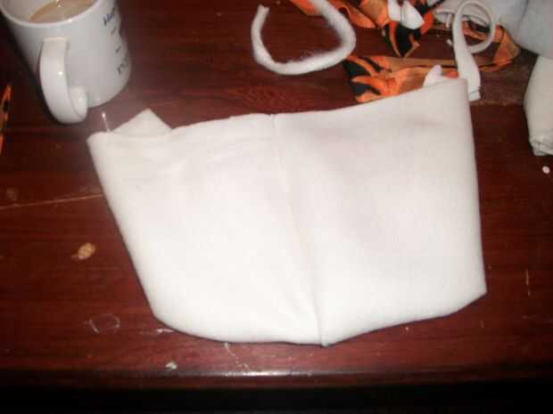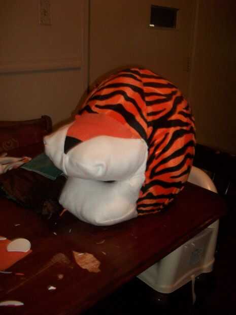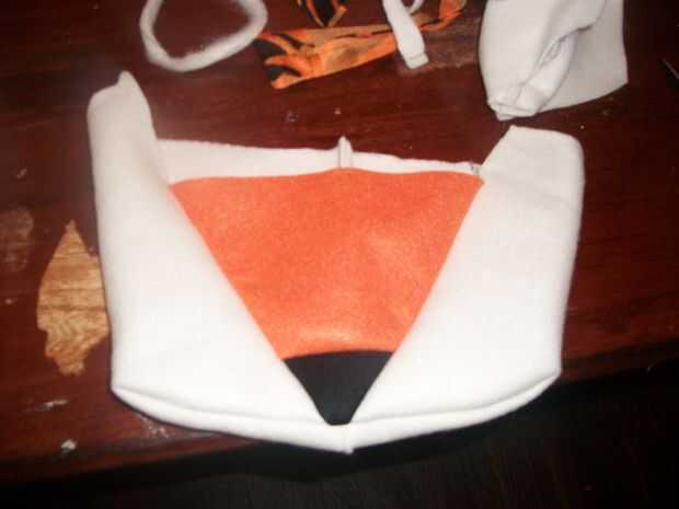 Esto fue de lejos la parte más difícil para mí. Cosí a piezas que parecían bolsillos. La primera fue la mandíbula nariz y parte superior. Usé lana blanco y hecho un bolsillo normal, corte un triángulo de la parte superior. Cosí a la tela naranja y negra en el medio de sustituir el triángulo. Esto creó el hocico y la nariz. Más tarde pegué una nueva nariz más grande en eso es un paso que puede saltar. El segundo bolsillo era sólo el blanco paño grueso y suave. Cuando coser redondo con dos bolsillos en la parte inferior. Casi todos los blancos en este pasos obtienen cubierto más adelante con la piel blanca o dentro de la boca. Usé cartulina para la estructura en la parte superior e inferior de la boca/nariz. Doblado cartulina para pegar en la cabeza. Rellena todo con polyfil y lo cosió en. Las mandíbulas eran demasiado lejos aparte y luché con lo que mira a la derecha. Honestamente pasó un día entero en esto y estaba todavía nunca loco cómo terminó. Pero después pegué la piel en ella, se conjugó muy bien. Cubrió todos mis parece y podía incluso todo. La piel era lo suficientemente largo que no se puede ver en se reconstruye. Así que no se estrese, es solo una estructura.