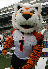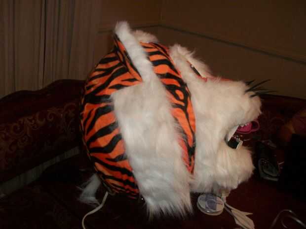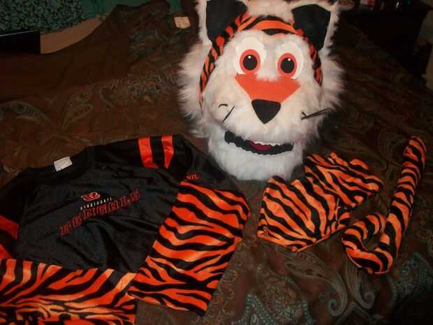 Corte un semicírculo de fieltro negro para la boca y pegado en lugar. I cortar la lengüeta de fieltro rojo y pega una pequeña franja negra de la negra y pegan. Los bigotes son pequeñas tiras de espuma negra, mano cosió en su lugar. Los dientes son 2 tiras de espuma blanca, corte irregular y pegado en lugar. Los dientes superiores que hice con grandes dientes puntiagudos en la parte posterior. Esta foto es después de la piel alrededor de la boca también. Cubrí el interior de la boca con tela negra pura. Todavía estoy trabajando en el resto de la vestimenta. Tengo un jersey de Bengals que cosí mangas largas con la misma tela de tigre. Guantes con 4 dedos de la tela de tigre. He incluido una foto de lo que he hecho. Él usará pantalones de fútbol con la parte inferior la mitad siendo el tigre de tela. También hice un "bastón" largo en forma de cola que te cosan a sus pantalones. Izquierda tenía una muestra de la piel y a hacer show cubre con él. Voy a actualizar esto como voy, pero no podía esperar! Gracias por mirar. La última foto en este grupo era mi cuadro de referencia. Faltó la marca jajaja pero había creado mi propia versión.