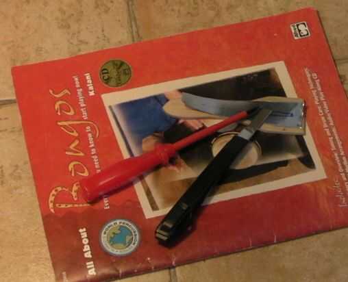 A) corte una forma de cuña por el una lado hoja de metal suave 1 cm a 2,5 cm del otro lado (tijeras) - vea la tercera figura