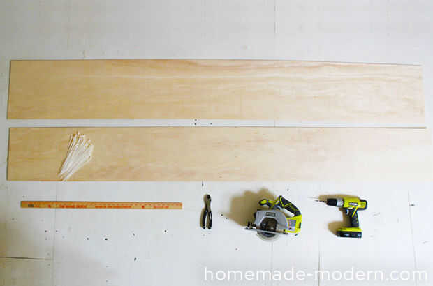 Hay un montón de diferentes tipos de madera contrachapada. Utilicé ¼" madera contrachapada que es lo suficientemente fuerte como para soportar mi peso, pero no puede soportar la prueba del tiempo. madera contrachapada gruesa de 3/8" o ½" proporcionan durabilidad superior. Tenía la madera cortada en tiras en Home Depot.