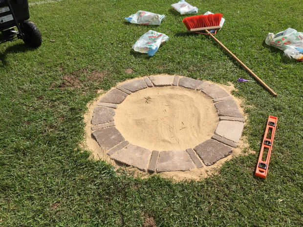 Después de las piedras fueron finalmente y nivel, he añadido una bolsa más de arena a lo largo de las piedras, luego con una escoba de tienda empujada la arena entre las piedras. Honestamente no estoy muy seguro de si esta parte era necesario, pero me pareció una buena idea, y tenía un bolso de la izquierda, por lo que en él fue. También, es realmente importante para las piedras con la escoba para asegurarse de que no existe ninguna arena sobre ellos para el siguiente paso.