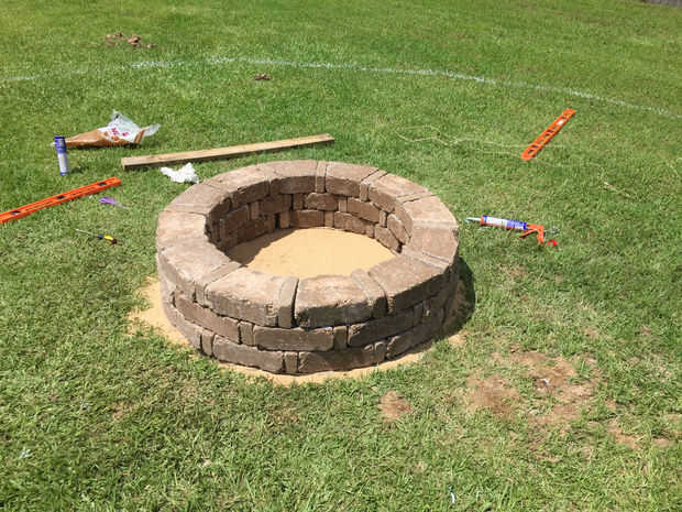 Para empezar en este paso, aplicar una capa de adhesivo de paisaje en forma de zig-zag donde va a poner la piedra siguiente del curso siguiente. Asegúrese de Escalonar las piedras sobre la capa anterior (se puede ver lo que me refiero en la foto para este paso). En la segunda capa (primera capa de este paso), intencionalmente dejó un hueco entre dos de los bloques para permitir el flujo de oxígeno. Continuar hasta que termine con todos los cuatro cursos de la piedra y Boom! Hoyo del fuego!