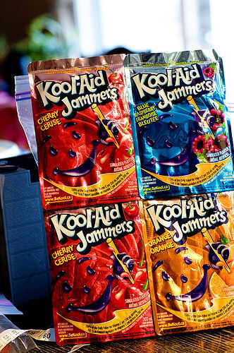 Disfrutar de este cóctel sin alcohol de Kool-Aid. Se hace de dos sabores en una mezcla y eventualmente un cóctel sin alcohol. Recoger cualquier sabores le gustaría, este instructable muestra uva y fresa.Paso 1: Escoge tus sabores, materiales y Reco