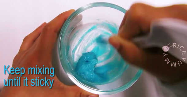 Agregar el pegamento blanco y mezclarlos hasta obtener pegajosa
