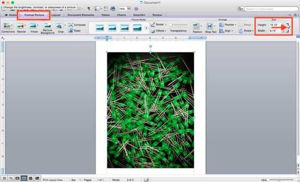 Haciendo doble clic sobre la imagen insertada, puede encontrar la ficha de formato de imagen en la parte superior (marcada en rojo en nuestro cuadro) para editar cotas. Recuerde hacer clic en la casilla debajo de la ficha tamaño, Restringir proporciones o mantener las dimensiones de la imagen de cambio. Manteniendo las mismas dimensiones de la imagen es muy importante! Sin marcar esta casilla, puede acabar con una imagen deformada, que no es deseable.