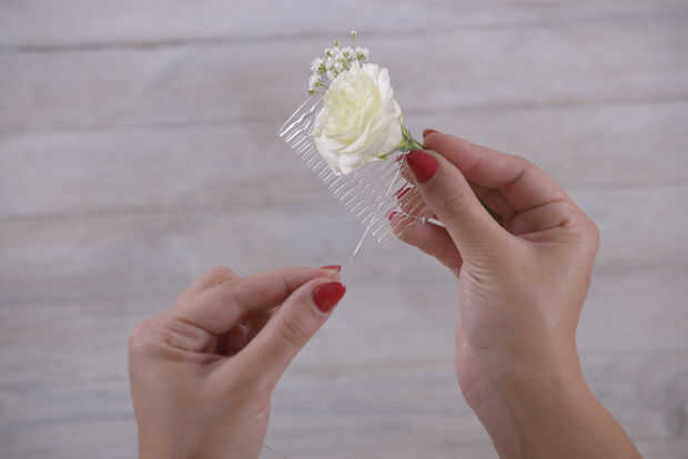 Para agregar esta flor, primero se corta el tallo de la flor por lo que sólo es ligeramente más largo que la diapositiva, si en todos. Entonces, colóquelo a lo largo del borde superior de la diapositiva, como con el bebé de aliento, sólo esta vez un poco más abajo. Luego continuar a envolver el alambre alrededor de las flores y los dientes de la diapositiva hasta que se une.