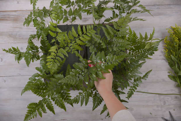 Ahora usted puede empezar con las flores! Helecho es una planta de gran relleno para dar volumen y profundidad a cualquier arreglo floral. Es una gran manera de realmente poner la esponja en una decoración de la caja a la vida!