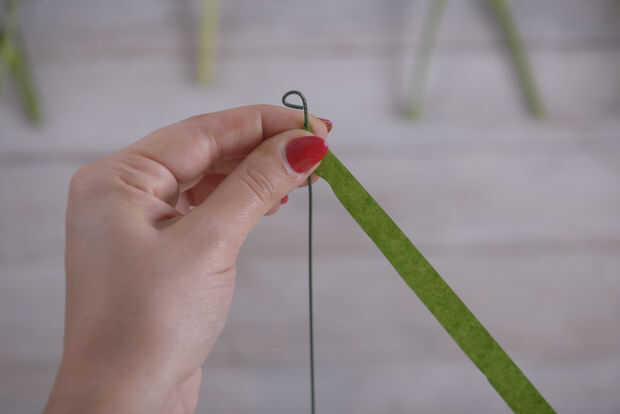 En primer lugar, utilizando el formulario de pinzas un bucle en ambos extremos con pinzas, debe buscar al igual que el bucle se muestra arriba en la imagen. Luego Envuelva el cable de cinta floral de arriba a abajo al igual que esta foto.