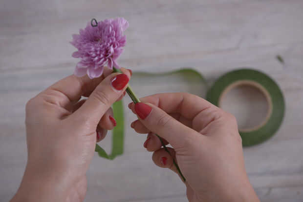 Coloque la primera flor en un extremo, lo más cerca del loop como sea posible y luego Envuelva el tallo corto con cinta floral. Envuelva la cinta lo más cerca posible a la flor para caber tantas flores como sea posible y mantenerlos mirando firmemente y asegurado a su corona.