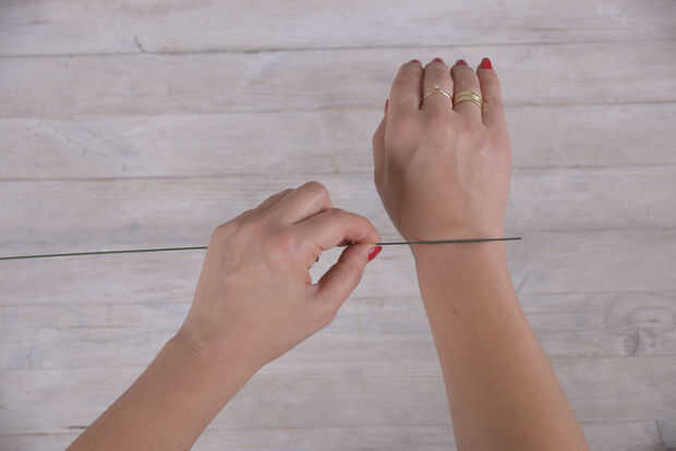 Primera tarea es medir el alambre para cortar la longitud correcta. Se debe medir para caber a través de la muñeca y dejar 2cm repuesto extra para asegurarse de que es cómodo, especialmente una vez que se agregan todas las flores. Luego cortar ningún cable extra que no necesita (puede siempre utilizar esto para hacer una pulsera de segunda para un amigo o familiar).
