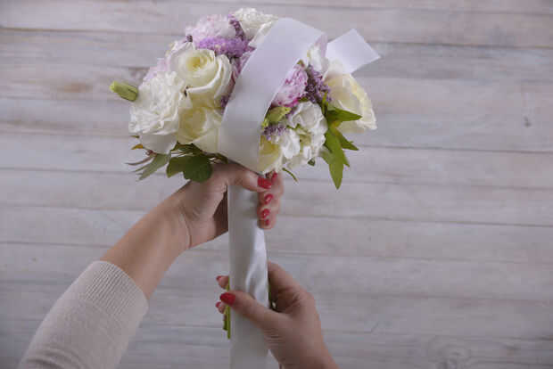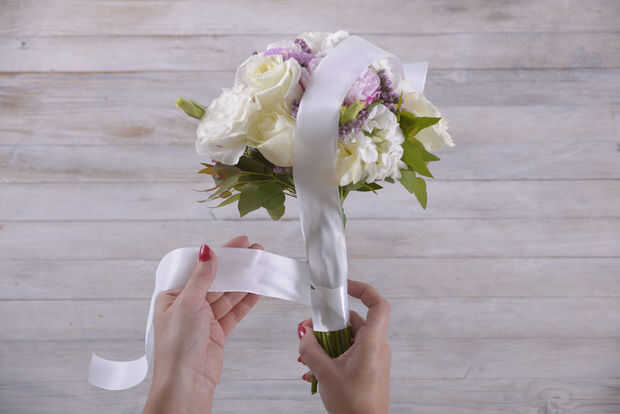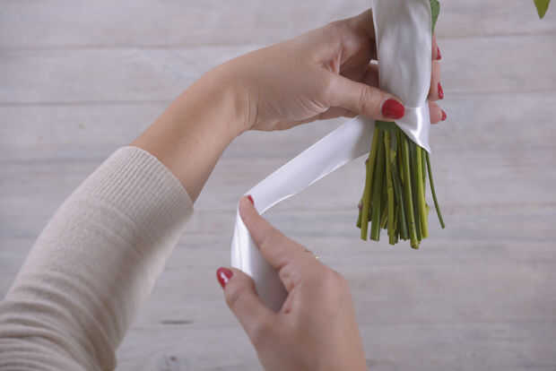 En primer lugar, coloque el lado brillante de la cinta hacia los tallos para que el lado mate es visible. Entonces puso un extremo sobre la parte superior de tus flores y envuelva el resto alrededor de los tallos. Dejar repuesto de aproximadamente 40cm en el extremo un nudo y añadir un arco.