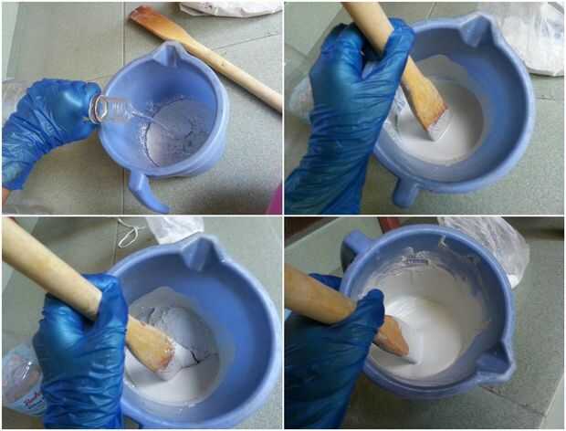 En primer lugar, vierta una pequeña cantidad de agua en la mezcla (cemento blanco y arena) y mezclar bien con el agua,