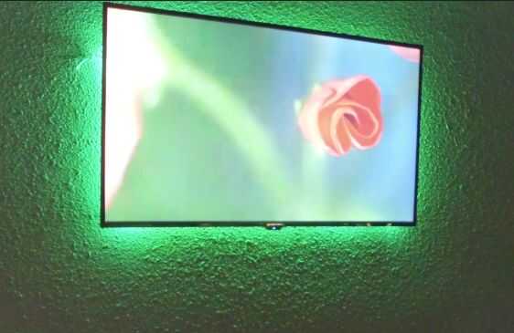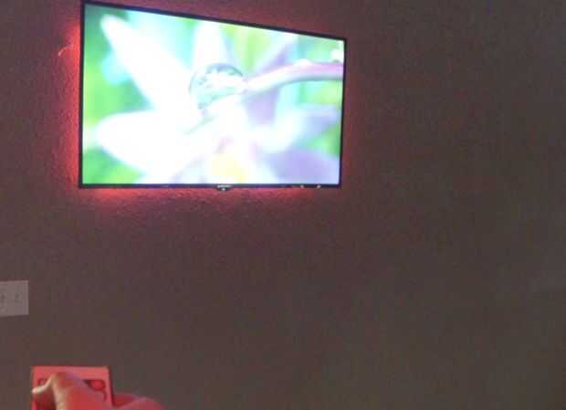 Para este proyecto le agregamos un contraluz del LED detrás de la TV montada en la pared. Hemos encontrado este genial, flexible, cinta de LED en Amazon. Es multicolor con control remoto y fuente de alimentación y 16 pies de tiras de LEDs para menores $16! Búsqueda de Amazon para: Kit de luz de tira Flexible impermeable de ADX 16,4 pies, 300 Color cambiante RGB LED con control remoto IR.