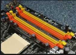 Continuación, debe agregar la CPU. En el área de la imagen superior la primera foto es la ranura de la CPU. Para obtener la CPU necesita empujar la palanca hacia abajo y tire hacia afuera de la sala y pones tu CPU en y no tocar la plata parte y cuando uno piensa es en el empuje hacia abajo la palanca y poner la palanca en la ranura y una pieza de plástico si hubo uno debe caer. Ahora a la memoria RAM Abra las aletas del lado y asegurarse de que la muesca en la ranura de RAM coincida con el espacio vacío en la memoria RAM. Deslice y presione firmemente hasta que escuche dos clics en el lado porque están cerrando las aletas. Si tienes dos palos RAM entonces puso otro en la tercera ranura si tiene cuatro ranuras o para ranuras anaranjado como la imagen y repetir el proceso. Asegúrese de que las ranuras de RAM más cercanas a usted.