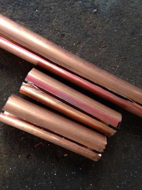 Comience por cortar el tubo de cobre por la mitad con la segueta o sierra sable. Este corte debe ser extremadamente recto así que tómate tu tiempo. Corté mis tubos hasta una 11" pedazo largo y dos 4" piezas.