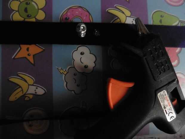 Con el pegamento caliente, pegamento abajo el arreglo solicitado en la cinta, en el patrón que más prefiera.