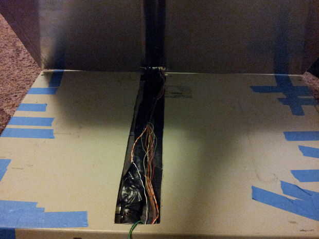 Ahora usted tendrá que cortar un agujero en la parte posterior de la caja como se muestra para permitir que todo el cableado para caer a la parte inferior de la
