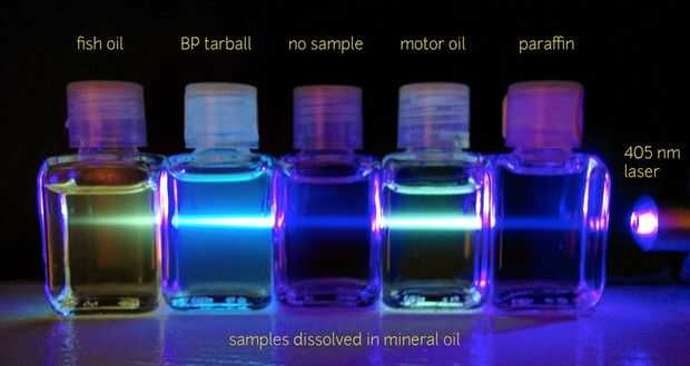 A menudo incluso se puede ver la diferencia con el ojo desnudo, aunque no se puede hacer una comparación precisa. La tercera imagen de arriba muestra un láser Blu-Ray, pasando por varios tipos de aceites - Nota los diferentes colores cada uno emita!