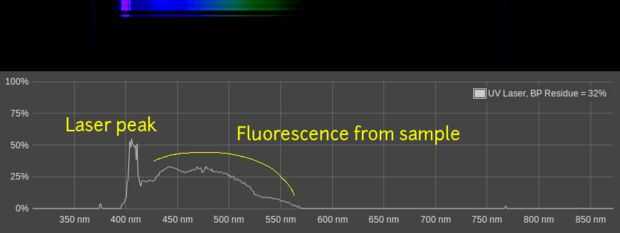 Cuando escanea la fluorescencia de una muestra de aceite, podemos ver claramente el color del laser, o longitud de onda, que es solamente en una gama estrecha alrededor 405 nanómetros, a la izquierda, como en la segunda imagen de arriba. Las restantes luz, a la derecha de ese pico alto, es producida por el material muy contento en la muestra. La forma de esa curva puede ser emparejada contra otras muestras que nos ayude a identificar lo que es nuestro.