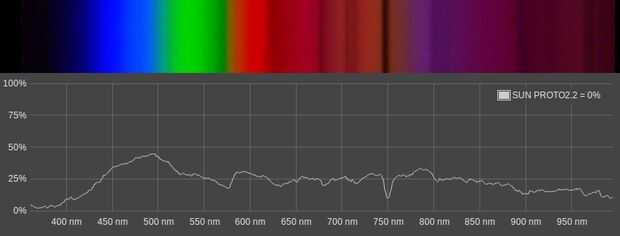 Luz de color es a menudo una mezcla de diferentes colores. Un espectrómetro es un aparato que separa los colores aparte, como un prisma y mide la fuerza de cada color. Una salida típica de un espectrómetro parece el espectro por encima del cielo durante el día, con el espectro de la luz real en la parte superior y el gráfico de longitud de onda (eje horizontal) e intensidad (eje vertical) por debajo.
