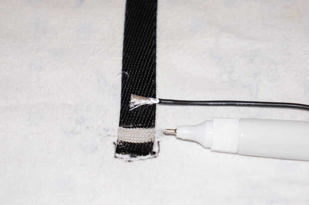 Pegar el cable con la cinta de carbón usando pegamento de alambre conductor de plata. Debido a la cola de plata, contactos será muy delgada, muy pequeño, no interferirá en una cama. Estos contactos fácil y rápidamente posible, y serán muy confiables.