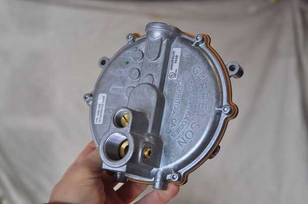 También necesitaba un regulador primario - que va directamente en el tanque de gas LP. Necesaria un 11 pulgadas del regulador de la columna de agua, que podrían proporcionar por lo menos 100.000 BTU. Son bastante comunes. Tomé uno en la ferretería local por 23 $. El regulador de demanda Garrettson fue ordenado por correo y costo $50 más gastos de envío.