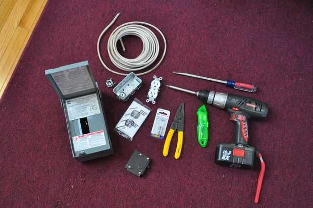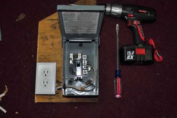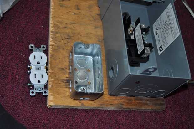 Compré la caja menos cara que pude en la ferretería y un solo interruptor de 20 amperios. También recogí un enchufe y la caja para montarlo en.