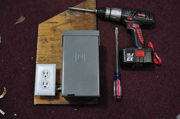 Atornilló la caja de interruptores y tomacorriente eléctrico a un trozo de madera contrachapada. Entonces había montado en el enchufe en la caja y había instalado la cubierta.