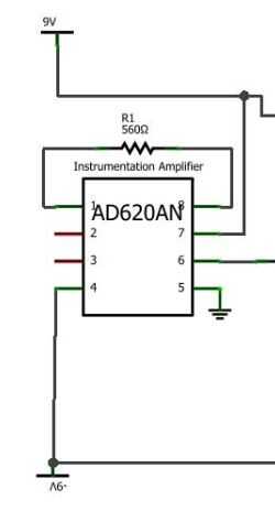 La hoja de datos para el AD620AN (nuestro amplificador de instrumentación) está aquí. De él, se puede ver que la fórmula de ganancia usando este chip es G = 1 + 49.400 / Rg, que equivale a un aumento de 89,2 con una resistencia de 560 ohm. Se trata de un buen número para obtener los datos en un rango no minúscula; vamos a añadir una forma de ajuste de ganancia sobre la marcha un poco más adelante. También verá en esta hoja de datos que en el circuito real, sus electrodos activos (los que no son el electrodo de tierra) se conectará al pin 2 y 3 (-IN y + IN).