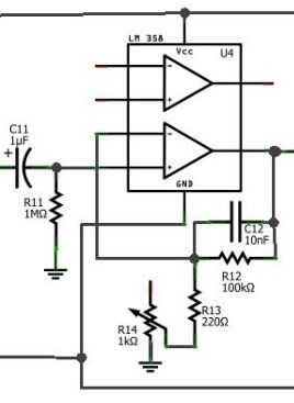 El propósito principal de esta sección, sin embargo, miente debajo de este, con el 220Ω resistencia y potenciómetro (pot para el cortocircuito). Este op-amp es un amplificador no invertir, y tiene una ganancia de G = 1 + R12/(R13+R14), (ignorando el 10nF condensador, ya que es un valor pequeño y no contribuye mucho a la ganancia). El potenciómetro es un resistor variable - cuando la entrada está conectada al pin de primera y la salida a la segunda, convirtiendo el limpiaparabrisas cambia su resistencia linealmente entre 0 y 1000 ohmios. Esto significa que cuando el bote se gira hacia la izquierda, la ganancia de este circuito es G = 1 + R12 /(R13 + 0) = 1 + 100 k / (220 + 0) = 455. Cuando se gira hacia la derecha, la ganancia es G = 1 + R12 /(R13 + 1000) = 1 + 100 k / (k 1 + 220) = 83.