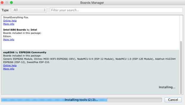 A continuación, utilice el administrador de la Junta para instalar el paquete ESP8266.