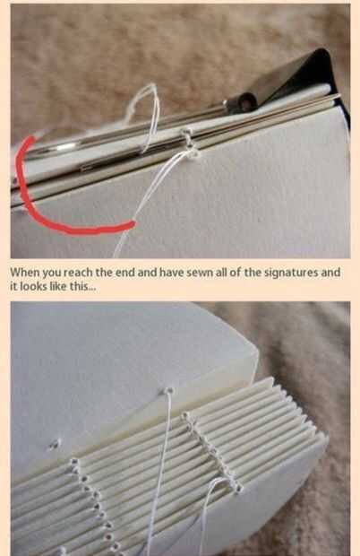 En primer lugar, hacer una cantidad apropiada de agujeros en las espinas de cada uno de las firmas (generalmente sobre 4), espaciados. Luego, agarra una aguja y un montón de hilo y empezar a coser desde el exterior. Luego, al llegar al final, poco a poco seguir sumando firmas y verlos juntos de la anterior. Una vez que han todos ha cosido juntos, unir las cuerdas al final como veremos.
