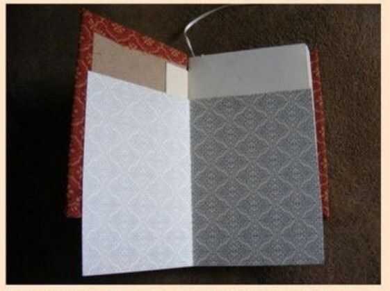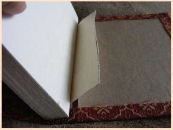 Ahora toma el libro y poner pegamento sobre la tela en la parte inferior de la columna y pegar esto en el centro de la tapa que acaba de hacer. Ahora el papel centrado y pegado a la columna vertebral. A continuación, tome las dos hojas decorativas de papel o tarjeta stock, rocíe algún pegamento y pegarlo o el interior cubierta. Para ello a la parte trasera también. Déjelo secar.